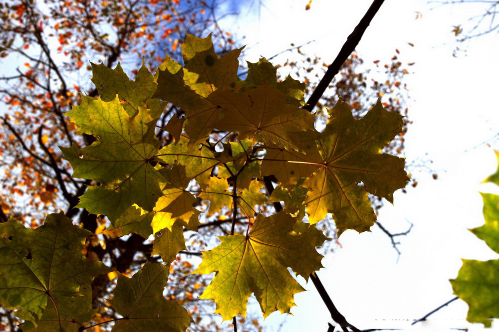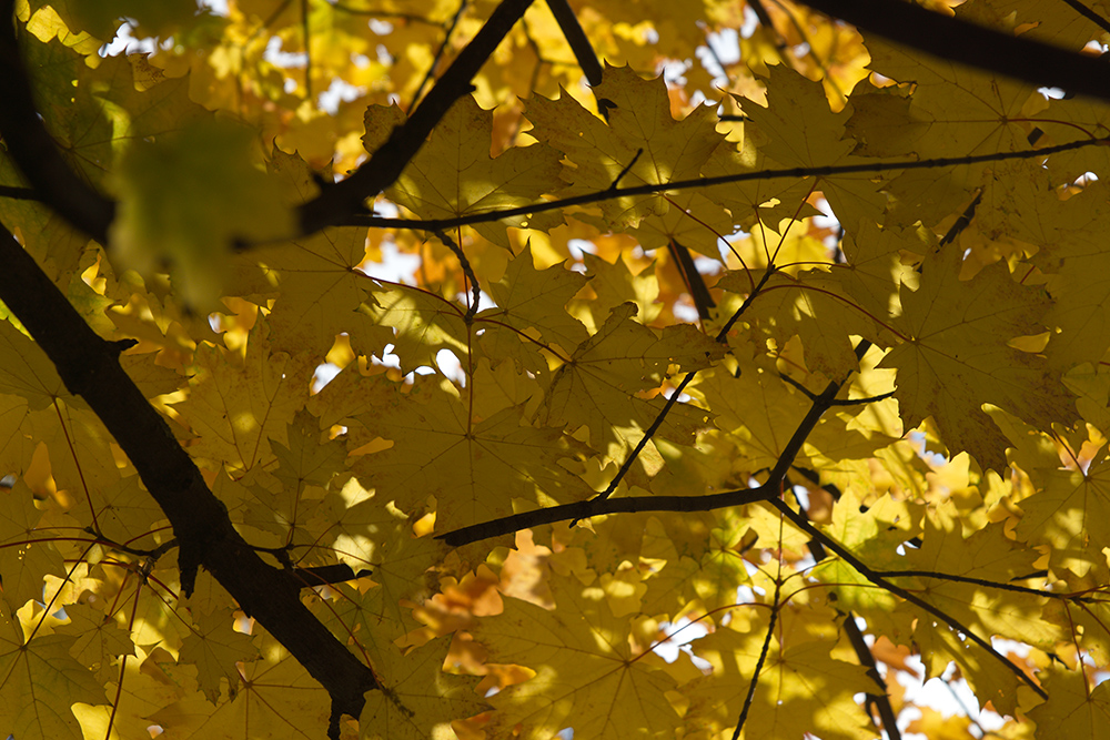 В лесу сейчас очень тихо. А при каждом порыве ветра слышно шуршание желтого дождя опадающей листвы, что ложится на землю удивительным ковром. Небо изумительной чистоты и голубизны. Такое бывает только осенью. На его фоне резко выделяются темно зеленые сосны и ярко желтые клены, чья листва словно наполнена солнечным светом, светится и придает всему лесу радостное очарование.