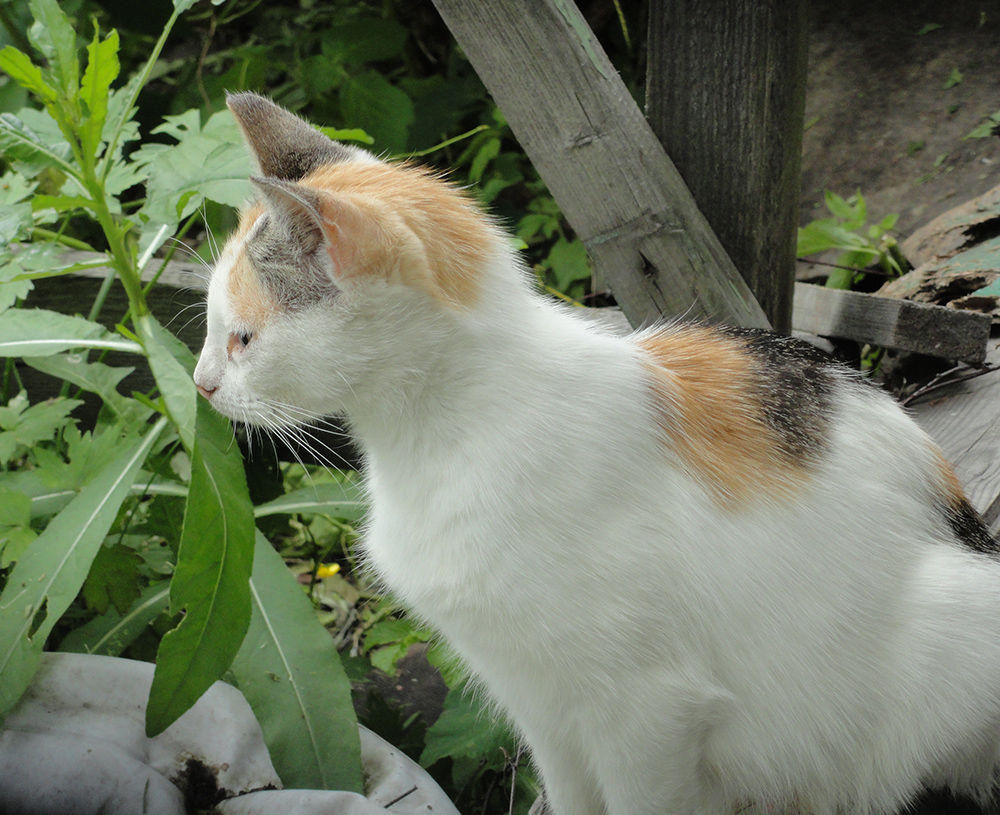 На участке обнаружили трупик зарянки, видно кто-то ее поймал, да не успел съесть, спугнули. Но вот, мертвую птичку увидел котёнок. Он насторожился, внимательно посмотрел и внезапно прыгнул, вонзив все свои коготки в добычу. Не пропала птичка, слопал ее котенок на обед, почти не оставив перышек. smile.gif