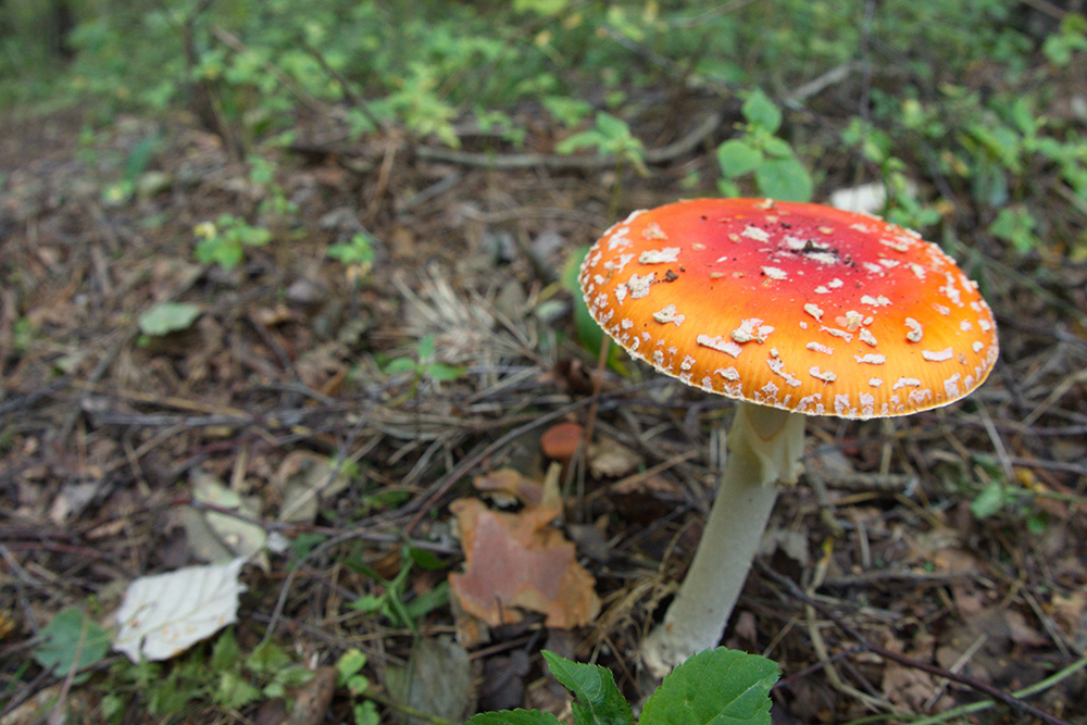 Стояла засуха, поэтому грибов нет. Совершенно случайно наткнулись на красный мухомор, он стоит, гордо подняв голову, и ни от кого не прячется. Зачем, ведь его никто не покушается сорвать. smile.gif
