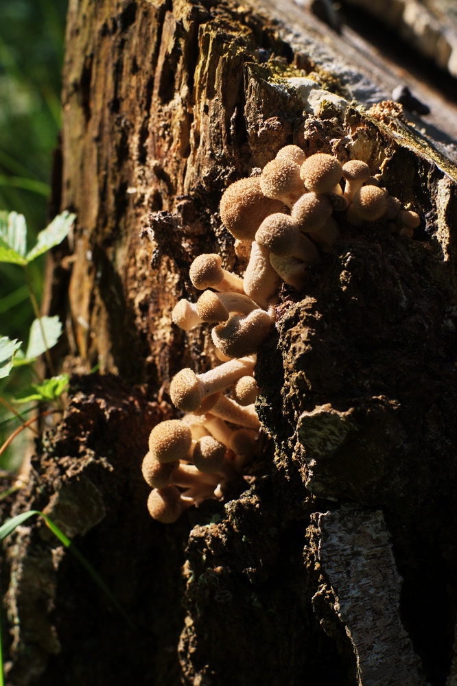 Но тут замечаю семейку нарождающихся опят на пеньке у самой тропинки. И глаза непроизвольно начинают обшаривать все вокруг. Углубляемся в заросли. Наши ожидания не напрасны. Кое-где все таки попадаются опята. Их совсем мало, но на раз хватит.