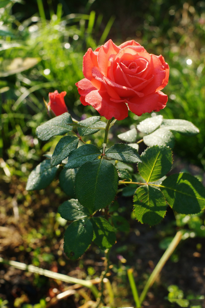 Вечером выпала роса. Она мелкими бриллиантами осыпала траву. На конце каждой травинки сверкает маленькая капелька. Газон выглядит изумрудным ковром, усыпанным драгоценными камнями.