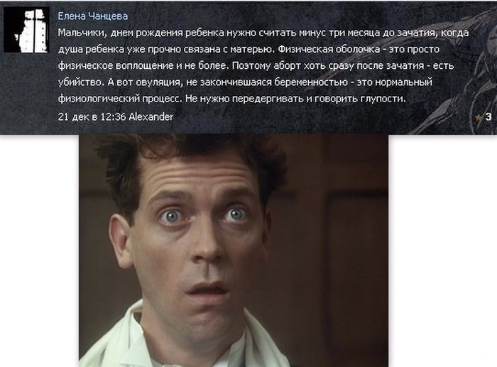 Хера себе, а как она про 3 месяца узнала? Но в любом случае трава у неё хорошая. У каждой яйцеклетки есть душа и с каждой овуляцией она отправляет эти души в мусорку. А потом из таких душ появляются маньяки... На оскароносный фильм ужасов тянет. Лену в главную роль надо в качестве яйцеклетки в мусорке.
