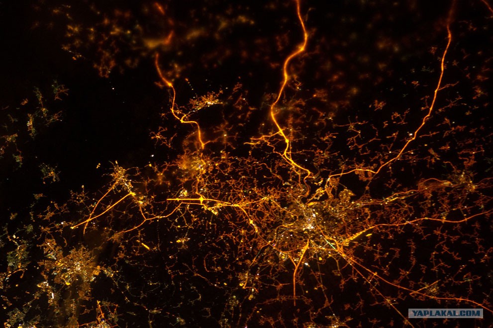 7. Ночной вид на Льеж, Бельгия, 8 декабря 2012. Ярко освещенные городские районы Льежа лежат в центре сети дорог, ведущих в сельскую местность Бельгии, которая является относительно темной. Расстояние слева направо составляет около 70 километров. Изображение было сделано с использованием инструмента Европейского космического агентства NightPod, который представляет из себя электро-механическую крепежную систему, предназначенную для компенсации цифровых камер при движении космической станции относительно Земли. Основной целью миссии являлось получение цифровых изображений Земли с высоким разрешением и длительной экспозицией, в частности, городов в ночное время.