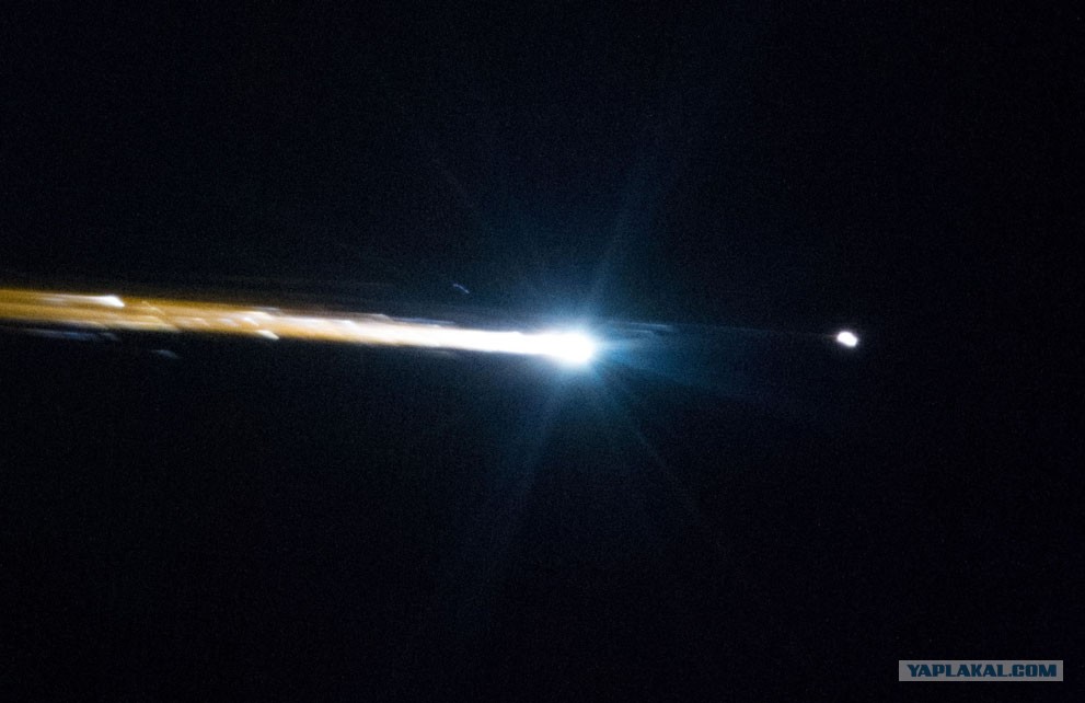 3. Союз ТМА-05М (спускаемый аппарат) входит в атмосферу Земли, оставляя за собой плазменный след, 19 ноября 2012. Экипаж экспедиции 33 совершил предрассветную посадку в степи Казахстана.