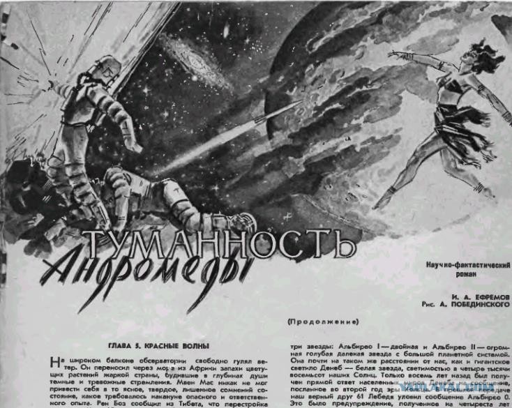 "Техника-Молодёжи" номер 5 за 1957 год, страница 22 - титульная картинка романа Ивана Антоновича Ефремова "Туманность Андромеды".