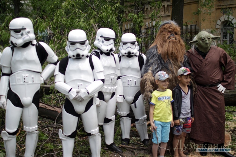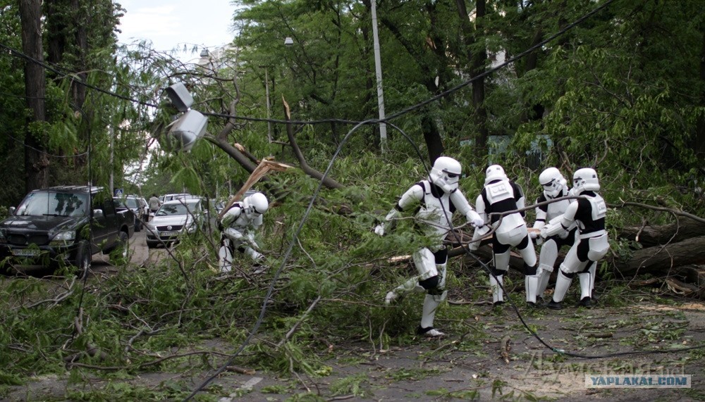 "В расчистке городских улиц от завалов принимают участие имперские штурмовики, магистр джедаев Йода, а также любимец публики Чубакка. Что касается Темного Лорда Дарта Вейдера, то генерал имперской армии и флота вошел в состав созданного мэрией оперативного штаба, который руководит ликвидацией последствий урагана."