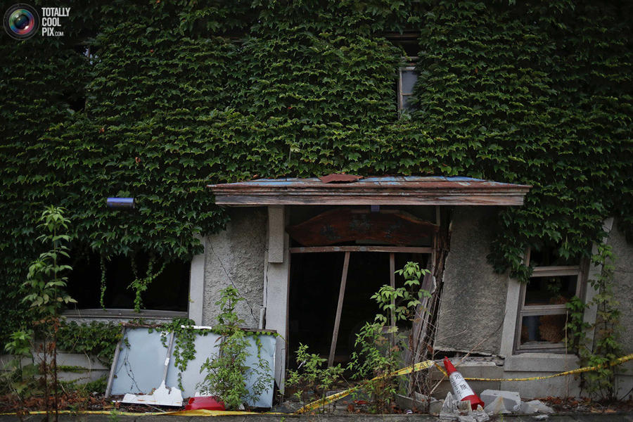 7. На доме, разрушенном землетрясением в 2011 году, в эвакуированном городе Намие, растут растения.