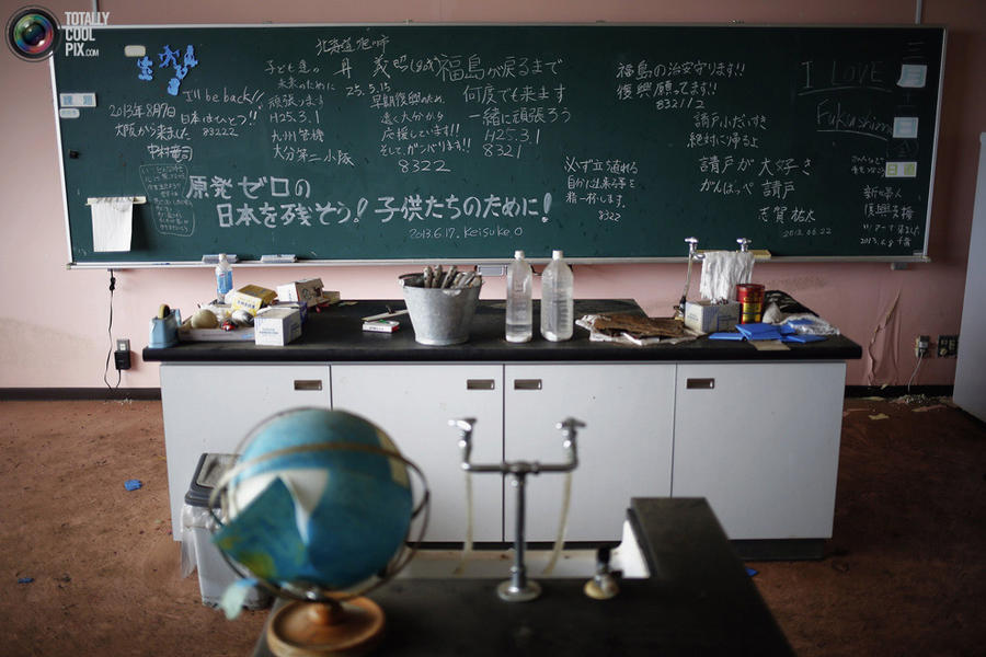 15. Сообщения поддержки записываются на доске в классе науки в начальной школе на уничтоженном цунами прибрежье эвакуированного города Намие в префектуре Фукусима