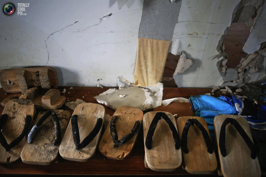 16. Традиционная местная обувь в заброшенном гражданском центре на уничтоженном цунами побережье эвакуированного города Намие в префектуре Фукусима всего в 6 километрах от разрушенной атомной электростанции «Fukushima Daiichi».