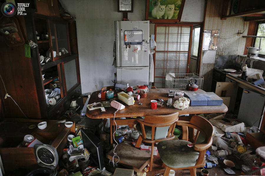 10. На кухне разрушенного дома в эвакуированном городе Намие в префектуре Фукусима, часы показывают время землетрясения.