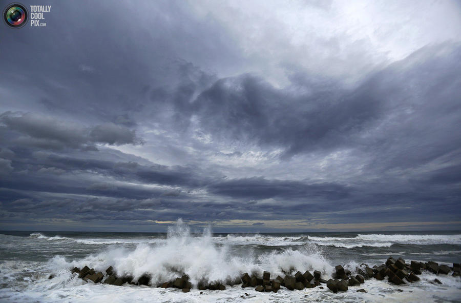 1. Волны бьются об ограждения от цунами, когда тайфун попадает в зону рядом с городом Иваки, к югу от разрушенной цунами атомной электростанции «Fukushima Daiichi» в префектуре Фукусима.
