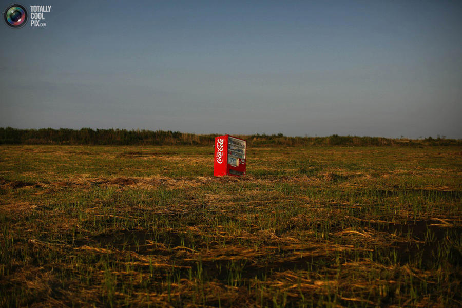 4. Торговый автомат, выброшенный на берег цунами, виден в заброшенных рисовых полях в зоне отчуждения в прибрежном районе недалеко от Минамисомы в префектуре Фукусима.