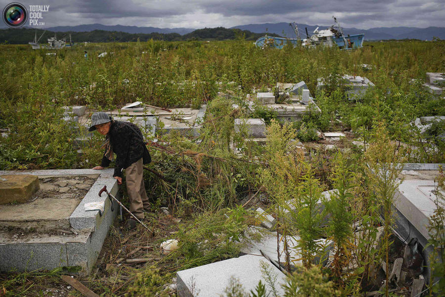 6. Пожилая женщина склонилась над могилой своих родственников на кладбище в разрушенной цунами прибрежной зоне эвакуированного города Намие в префектуре Фукусима.