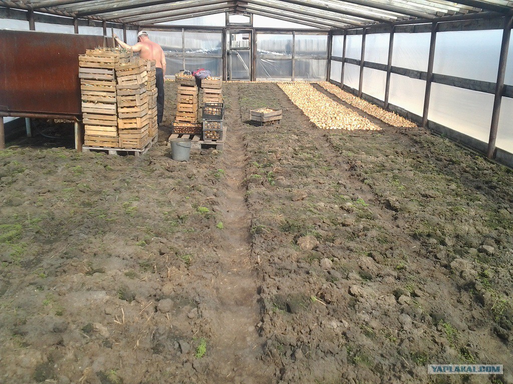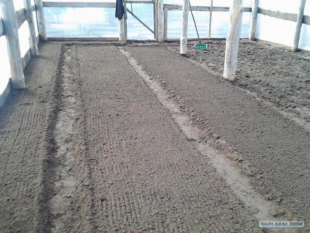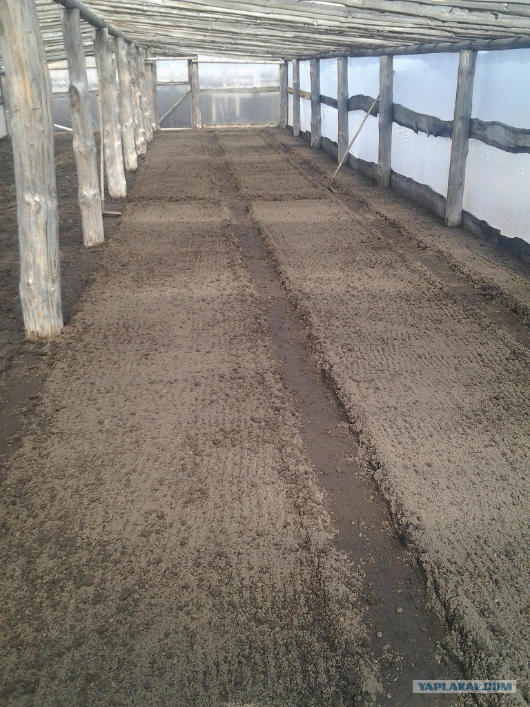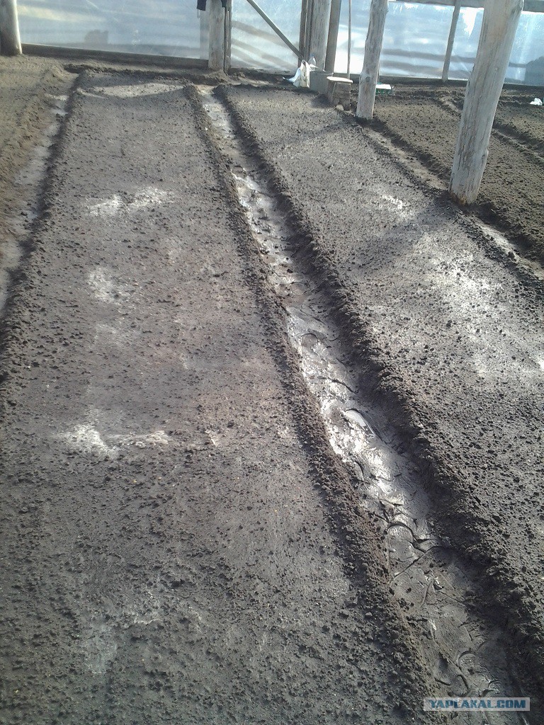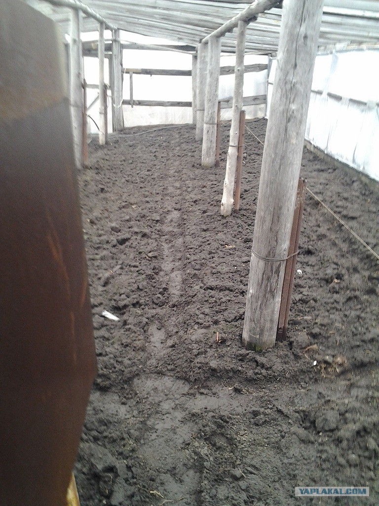 Теплицы кроются пленкой, но фото не сохранено. Копаем землю, делаем гряды.