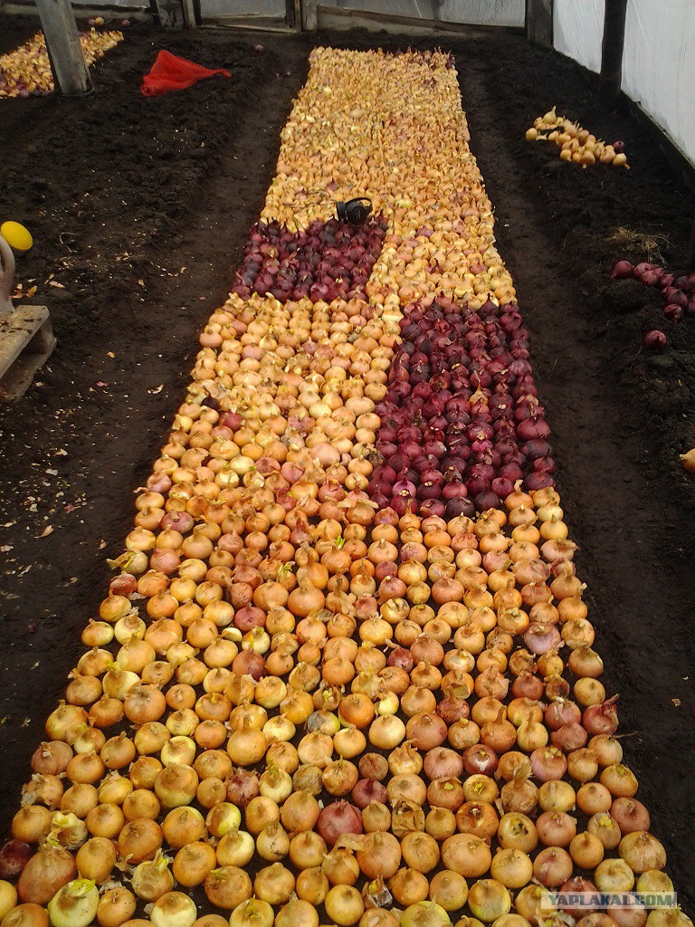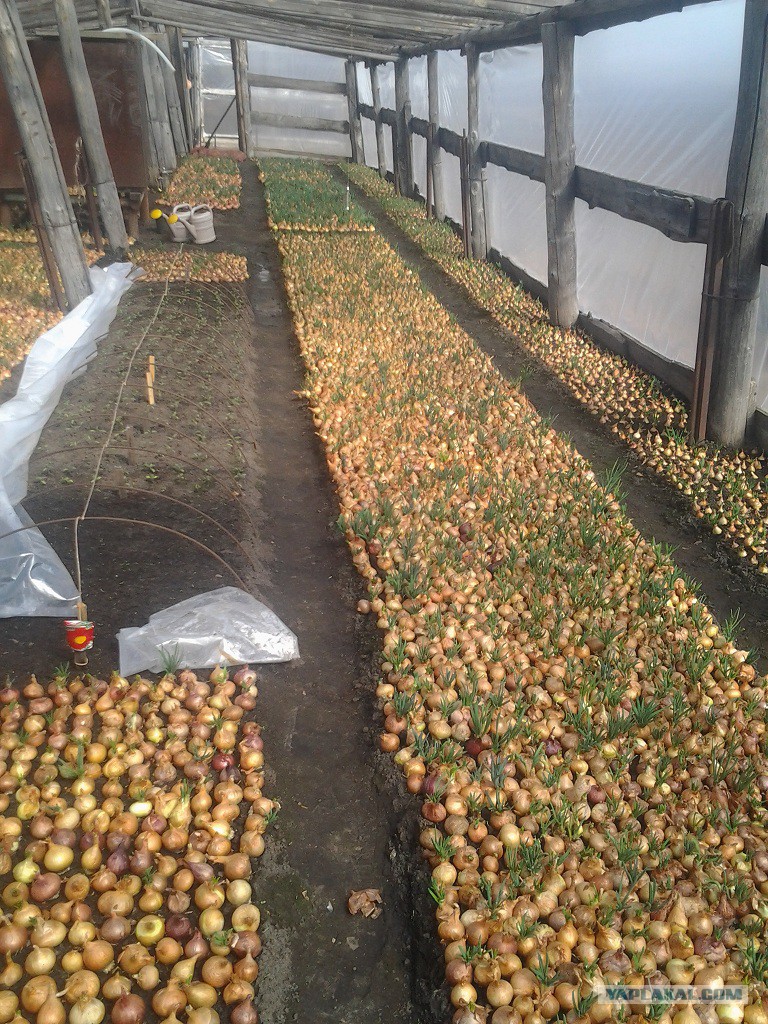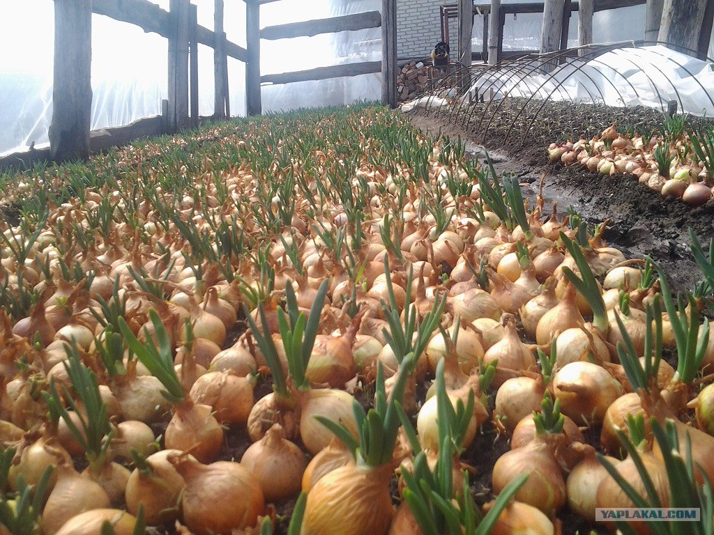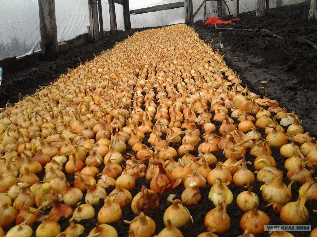 Достаем из подвала лук, и начинаем садить. К слову репка для посадки выращивается так же своими силами.