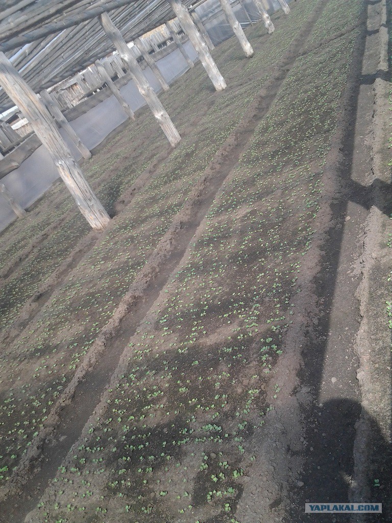 Заглянем к редиске...Проросла... К слову, на момент начала посадки первой теплицы на улице середина марта и лежат сугробы, а мы загораем в шортах))