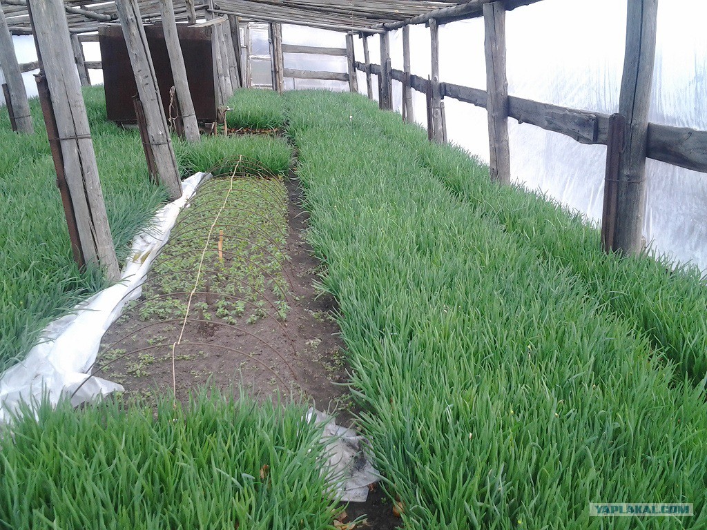 Закрываем и уходим в третью теплицу... Пока готовим землю в третьей теплице, заглянем в первую?! Слева под дугами помидорная рассада, которая будет жить в этой теплице после лука...
