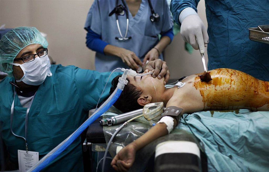 18.Американский анестезиолог (слева) готовит к операции палестинского мальчика, раненого в Газе. 2009 г.