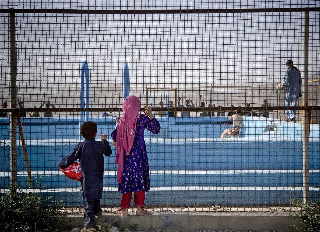 2.Афганские дети смотрят на купающихся в бассейне на американской военной базе, 2013