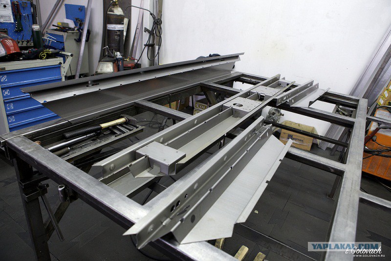 Детали двери, разложенные в определённом порядке для сварочных работ.