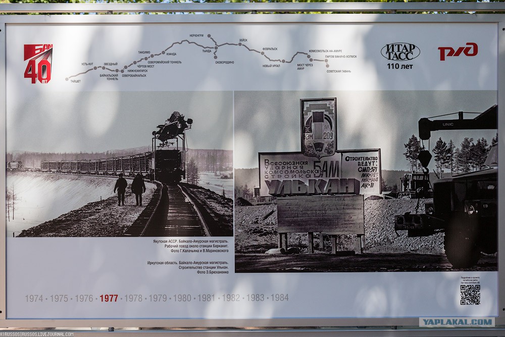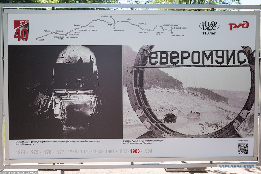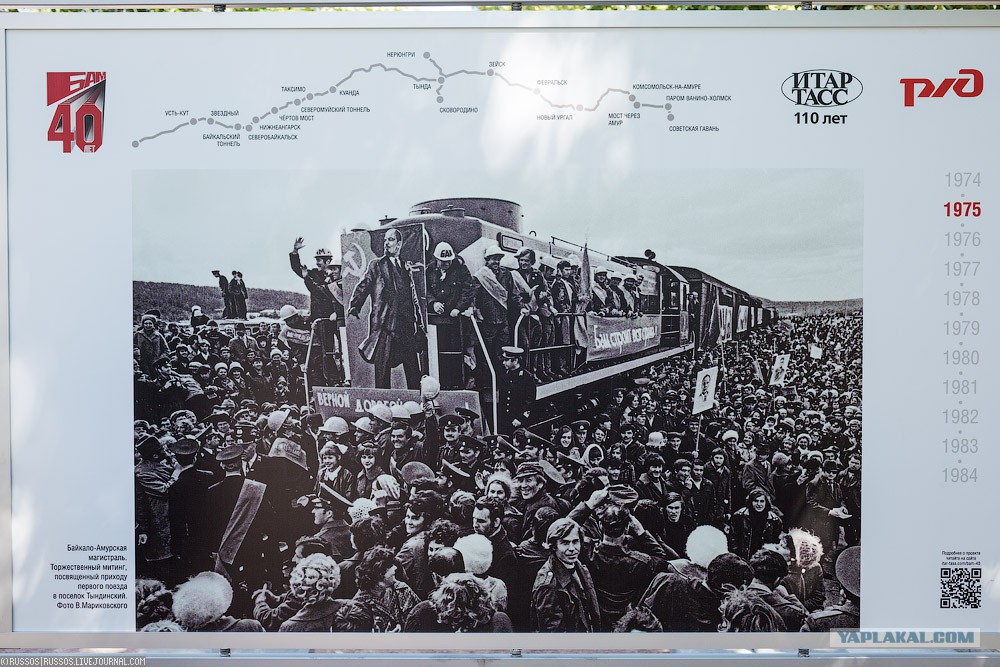 «В экспозицию вошли более 400 архивных фотографий ТАСС 1974 — 1984 гг. о великой стройке века. Выставка представляет собой фотоисторию Байкало-Амурской магистрали: здесь представлены уникальные кадры строительства железной дороги, жизни и быта строителей, а также кадры природных ландшафтов, которые прежде никогда не публиковались в СМИ и не демонстрировались ранее».