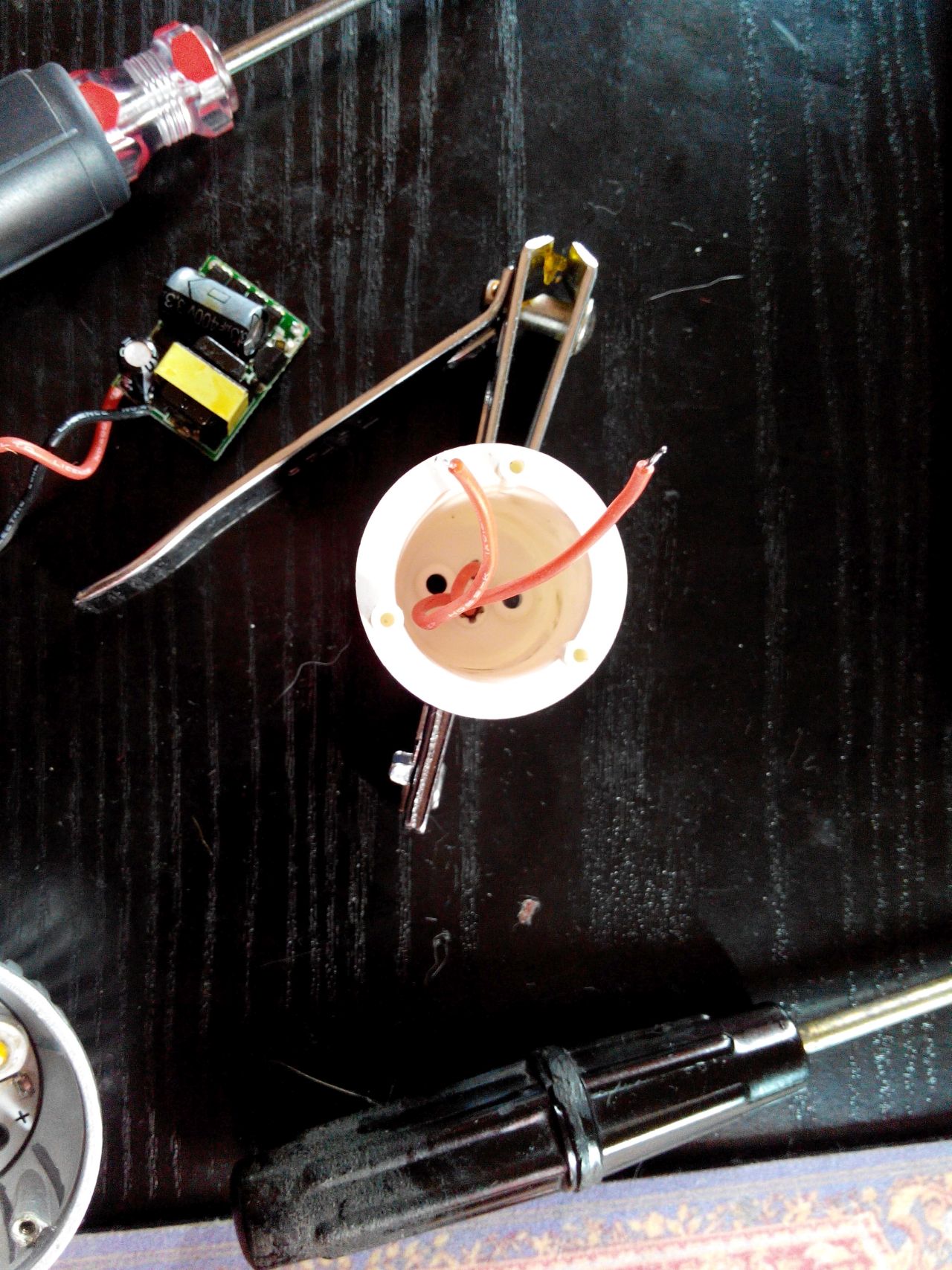В моем случае возникла небольшая заминка, т.к. провода идущие к патрону лампы были не припаяны, а обжаты в конекторах. Значит легче было оставить провода от патрона и припаять их к плате нового БП, предварительно отпаяв имеющиеся на нём.