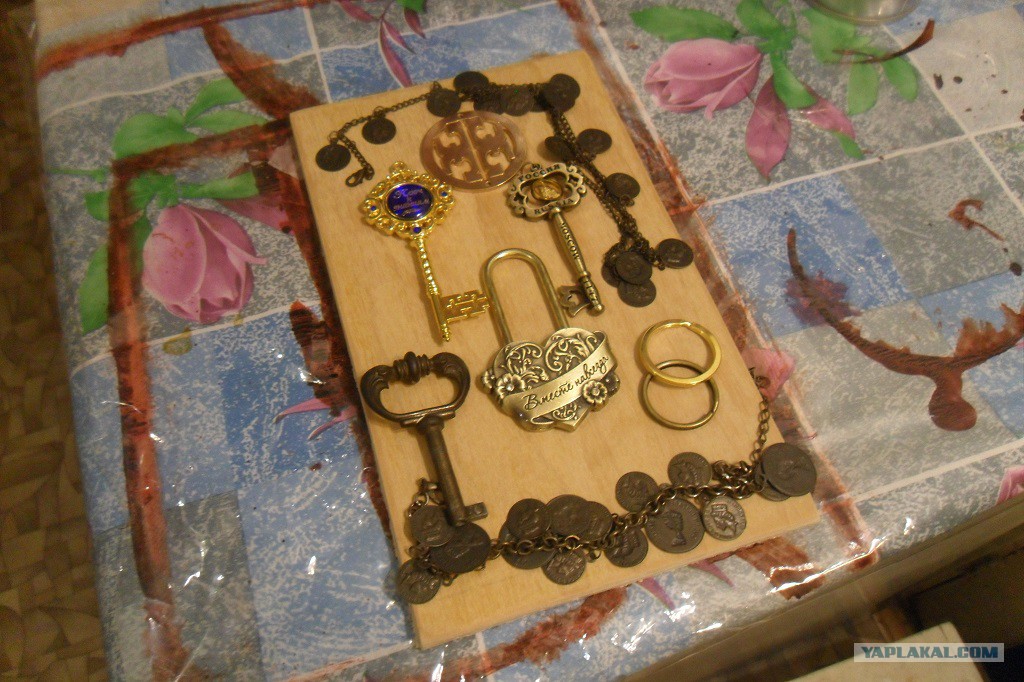 Опыта успешной работы с супер-клеем не было. Был печальный опыт склеивания пальцев. Но, все таки решился и понеслась. В центре композиции – замок, вокруг ключи. Как будет выглядеть в целом еще непонятно, но уже красиво.