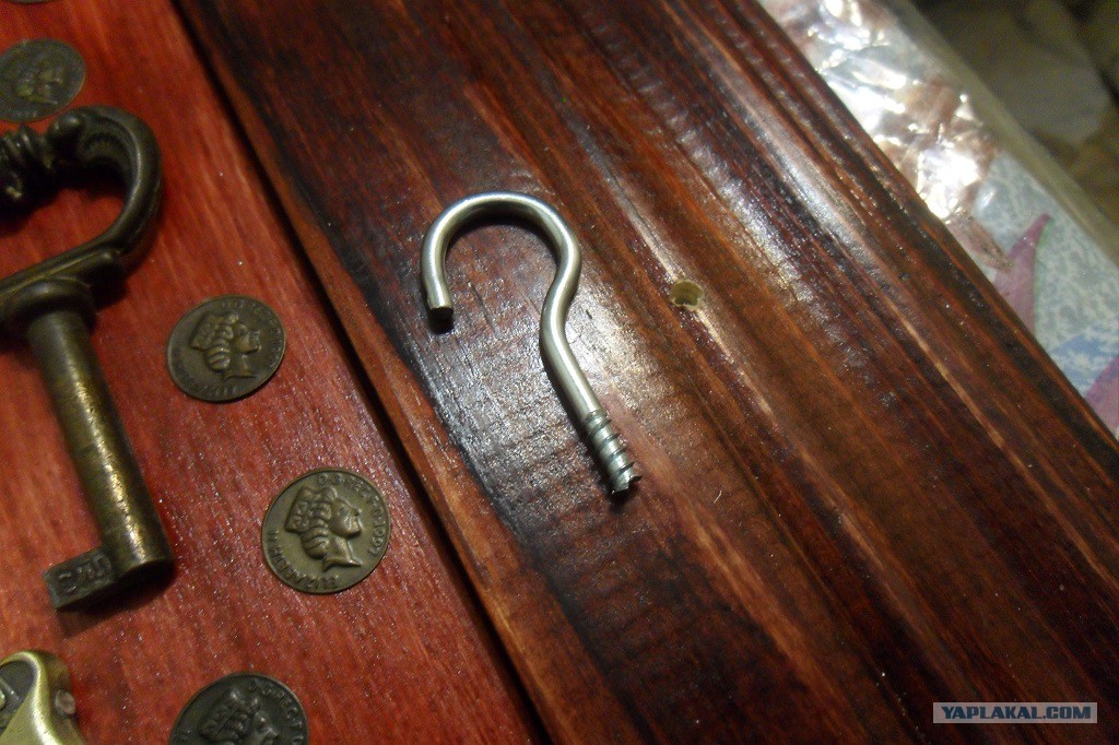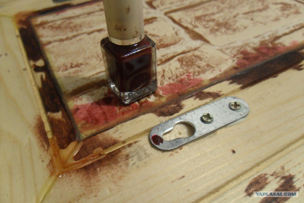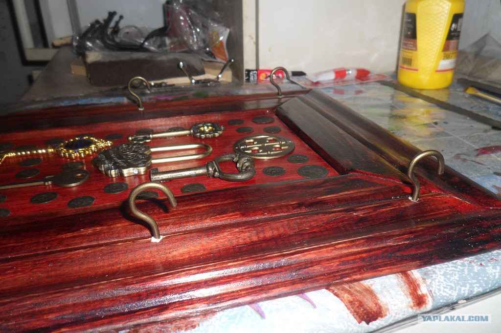 23. Возникла проблема, как подвесить ключницу РОВНО без перекосов. Решил просто, занял у жены лак (она такой цвет не жалует), отметил места под сверление, приложил к стенке. На стенке отметились места, в них и засверлился. Повесил на пластмассовые дюбель-шурупы.