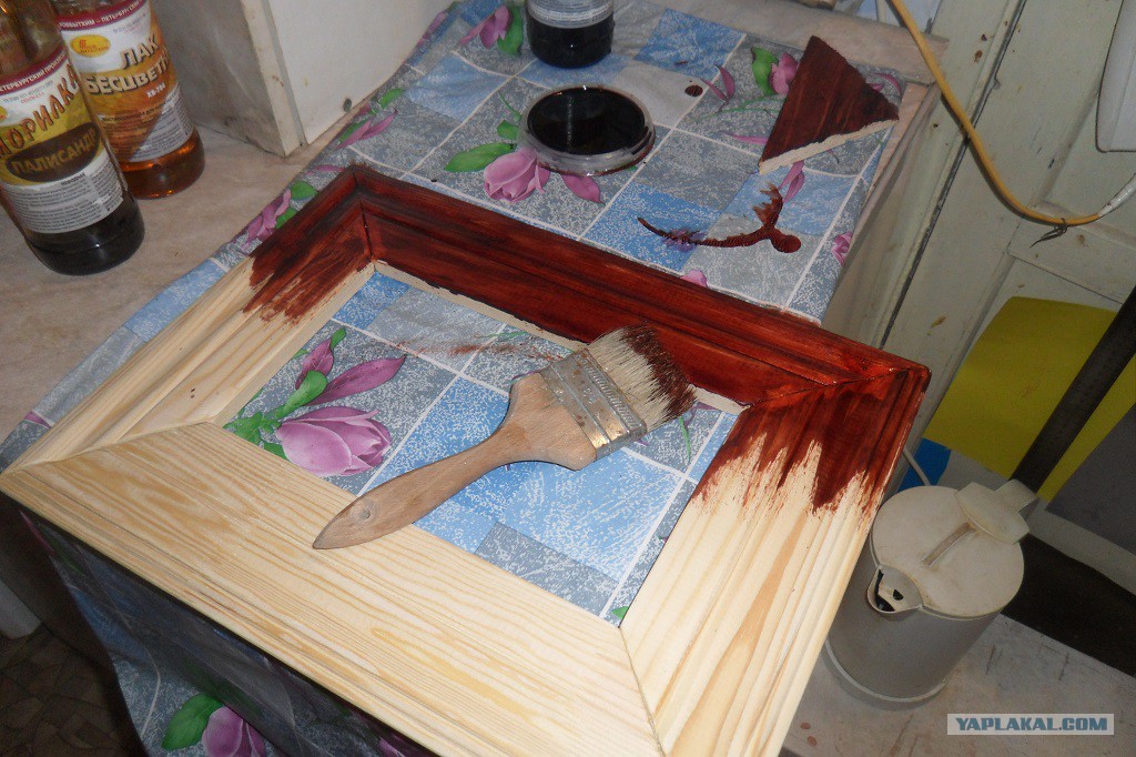 6. Насмотревшись разной мебели и оттенков благородного красного, решил красить морилкой под красное дерево. Морилка липкая и сильнопахнущая. Проветривать просто обязательно, так в инструкции и написано. Но мы читаем их потом, когда голова уже болит и пляшут перед глазами веселые чертики.