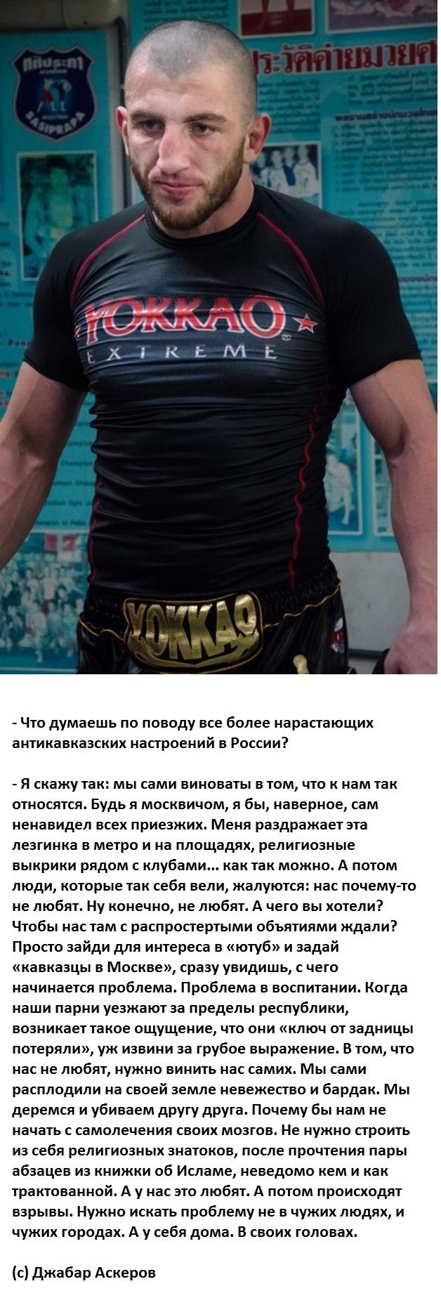 Что то такая глубокая мысль совершенно не вяжется с понятием "Чемпион Европы по тайскому боксу Джабар Аскеров". Явно писал кто то другой.