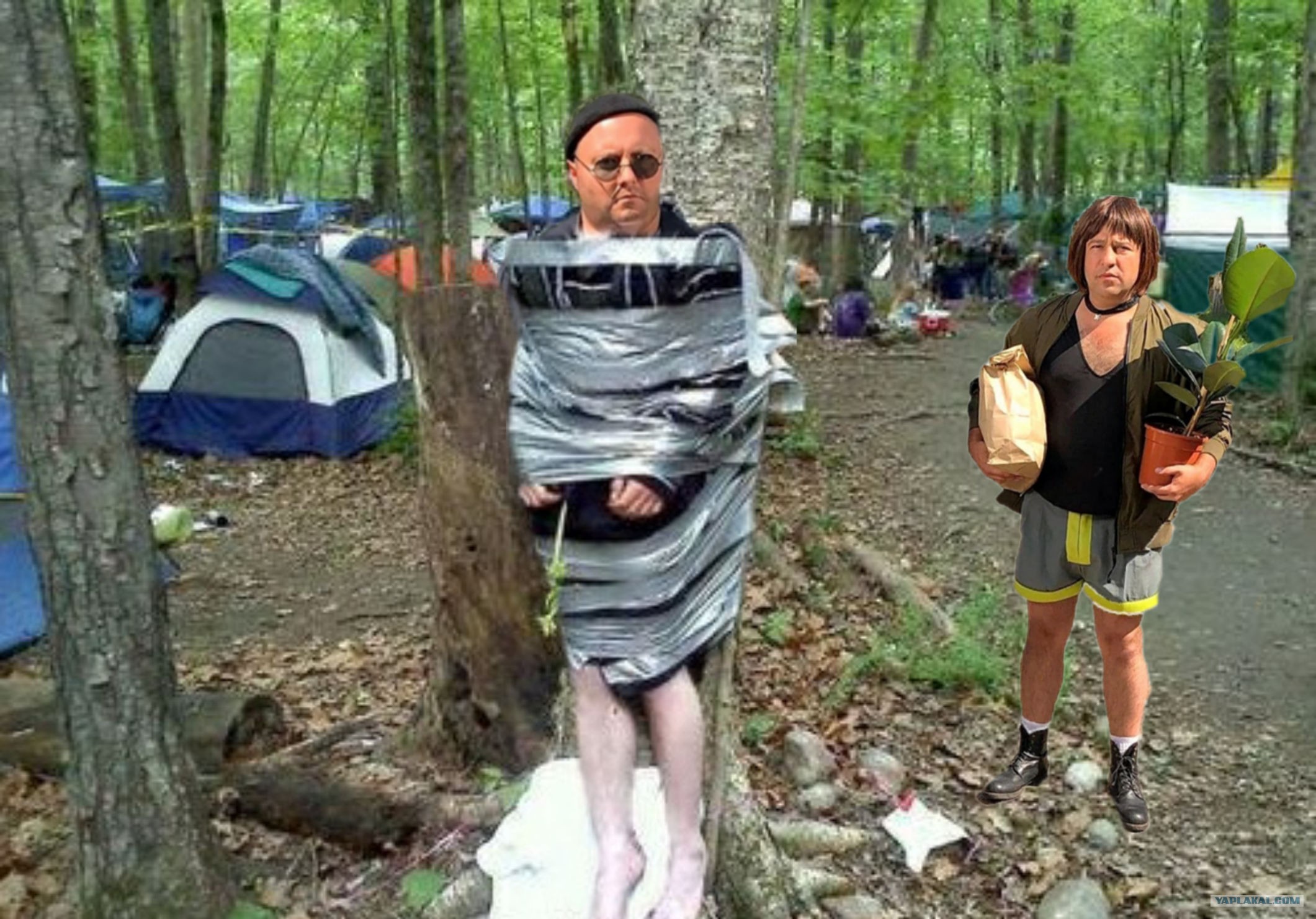 Мужик, привязанный к дереву кричит на полянке в лесу:
