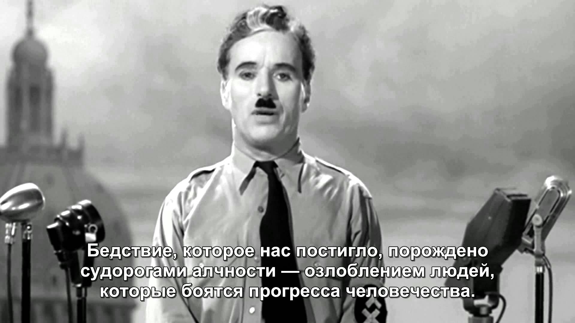Великий Диктатор. Только бедняк, похожий на диктатора, в своем неистовом желании справедливого мира осознал, что похож на своего антагониста. Дракона убивший сам становится драконом.
