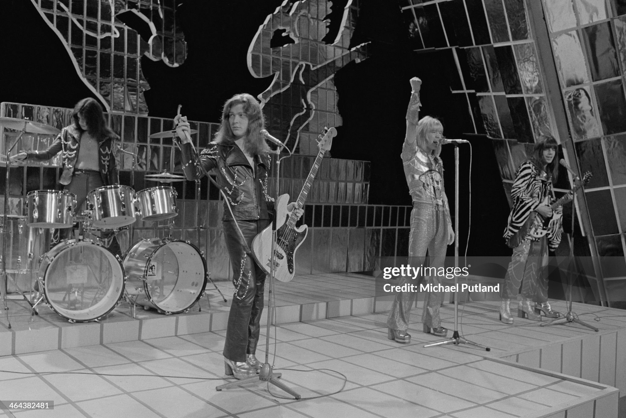British glam rock group Sweet performing on the Christmas Day edition of the BBC TV music show 'Top Of The Pops', broadcast 25th December 1973. Left to right: Mick Tucker, Steve Priest, (1947 - 2002), Brian Connolly (1945 - 1997) and Andy Scott. (Photo by Michael Putland/Getty Images)