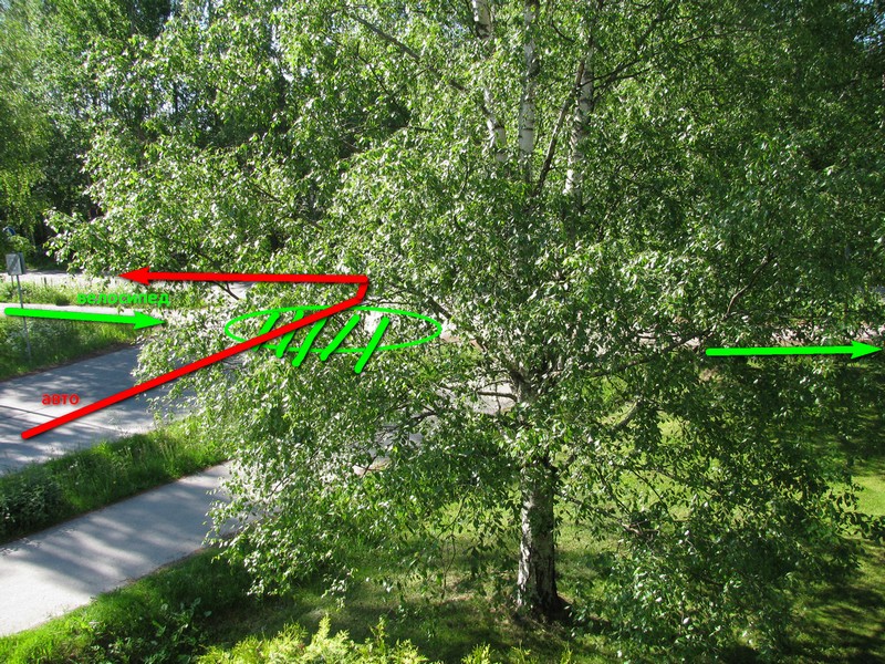 Живу в Финляндии, в городишке Туусула... Два месяца назад моя соседка сверху на пешеходном переходе сбила велосипедиста. Место сфоткал с балкона только что, простите за корявость. Велосипедист ехал по дорожке для пешеходов и велосипедистов и рванул через пешеходный переход НА велосипеде... прямо под колёса. Приехала полиция и сказала, что виновен велосипедист, так как надо было либо слезть с велика и идти пешком, либо соблюдать ПДД и пропустить помеху справа... Ей, Богу, не вру.