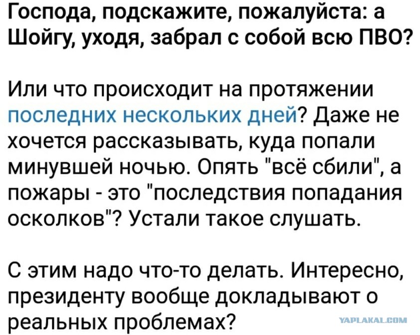 - Путин сказал что санитарную зону надо делать, делать так чтобы хохлы до чего-то важного достать не могли. Сейчас они нам продемонстировали, что надо еще в сторону западной Украины Польши фронт сдвигать... Сколько там от хохлов до Туапсе, километров 600? Вот настолько надо сдвигать фронт на запад. И это не финал.