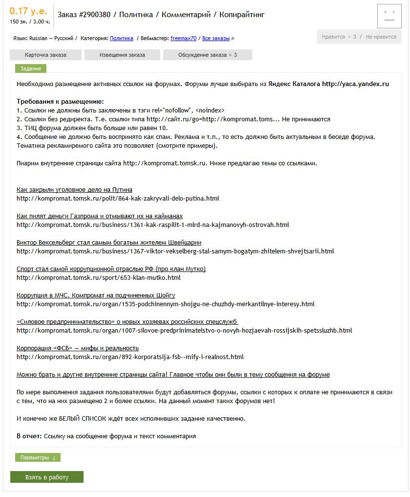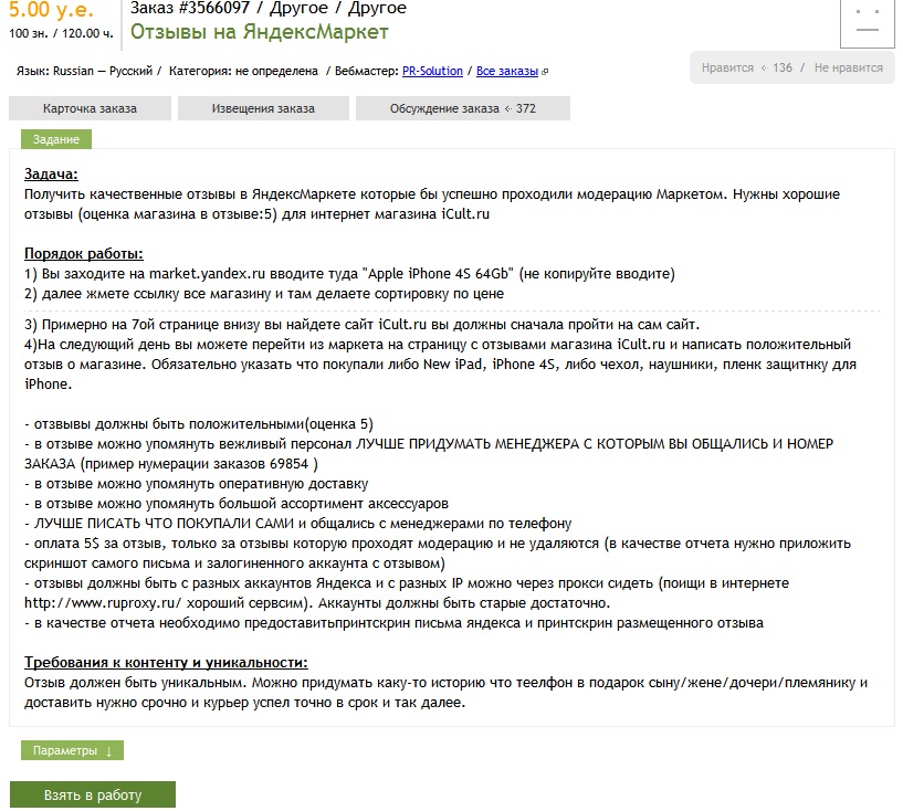 На скрине самый дорогой. Сам на этой бирже(advego.ru) зарегился года 2 назад, заработал 900р, решил, что графоманство - не моё, и забросил это занятие. Отзывами не грешил.  pray.gif