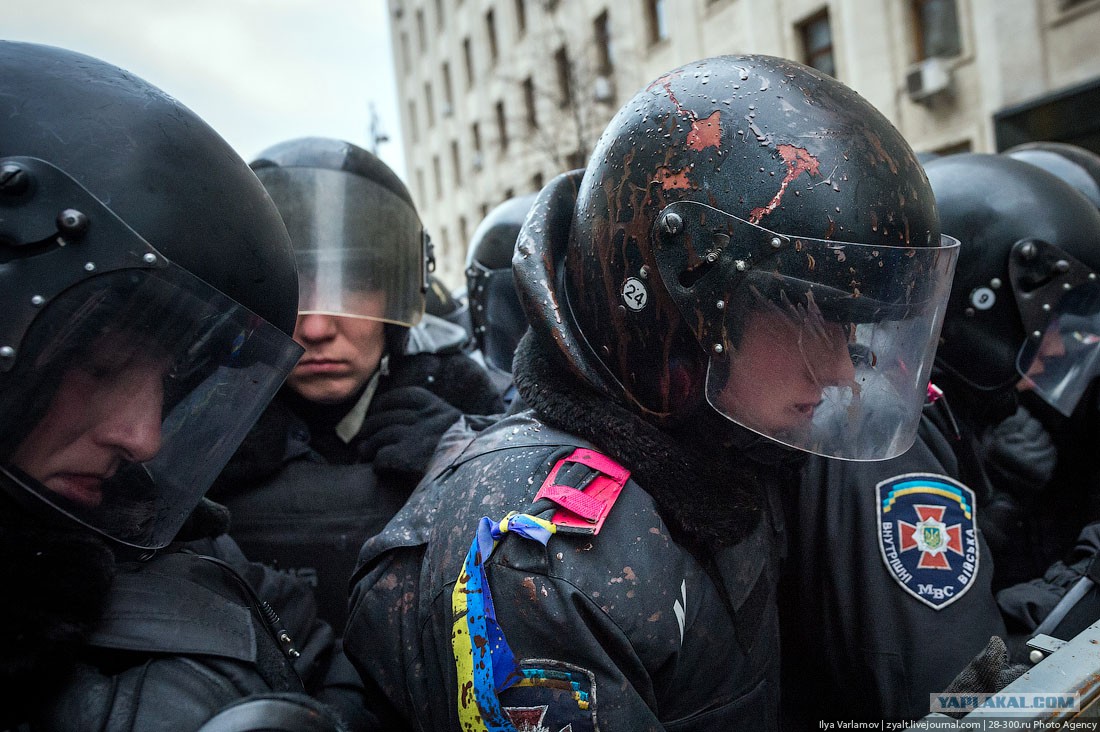 25. Обратите внимание на каску. Бордовые пятна - это следы после ударов камнями. Молодежь разбирала тротуары и закидывала камнями оцепление. Представляете себе кирпич, которые летит в голову? А теперь представите себе сотни таких кирпичей. Звук такой, как-будо град идет.