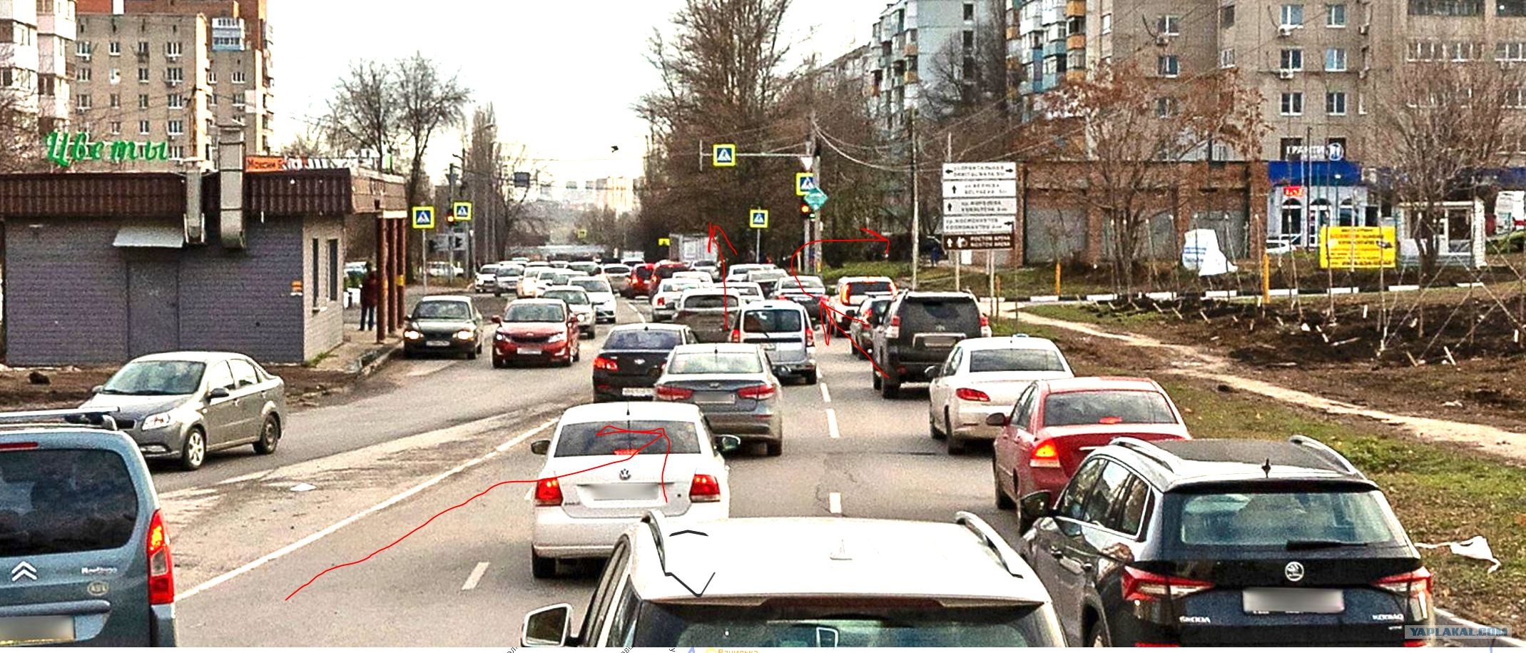 По панораме прекрасно видно что с левой полосы люди поворачивают налево, и в ролике это тоже видно т.к. несколько машин не успели это сделать и стали на перекрестке. Правая же полоса используется для проезда прямо (смотри панораму Ауди) и направо. Знаки которые стояли сзади идут лесом ибо действие знака заканчивается на ближайшем пересечении проезжих частей, а это произойдет до нашего перекрестка т.к. есть разворот, есть заезд на заправку. Отсюда мы имеем тот момент что регик ехал по правилам и мог он стоять там сколько ему вздумается, а то что у бабы пмс это не его траблы. Что касаемо сделать по-человечески проехать чуть вперед и левее. Еще раз откройте панораму улицы и поймете что сделать это без нарушения ПДД невозможно, отсюда момент что для того чтобы поступить по-человечески мне надо нарушить ПДД. Кто хочет это делать, ради бога, красавцы. Я бы хер это делал, не нравится перекресток пмсникам , вам прямая дорога в дорожную службу для установки знаков. Регик не обязан нарушать правила чтобы кому то угодить.