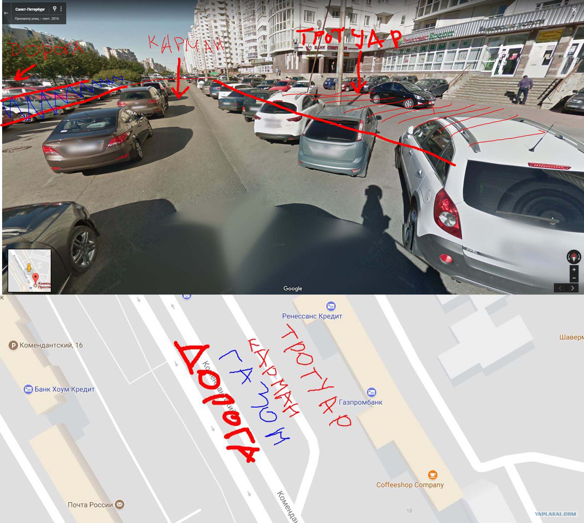 Там ДАЖЕ БОРДЮРОВ НЕТ. Сплошная поверхность, без разделения, и поди догадайся - где там закончился бордюр и где началась проезжая часть, при том что со всех сторон стоят рядами машины - и там где обозначен карман, и там где дорога, и там где теоретически тротуар.