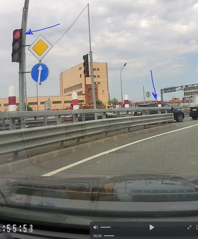 Регистратор первый выехал на перекресток, но не видно в моменте какой у него горел свет именно при выезде на перекресток. Границы перекрестка тут обрисовал на скрине.