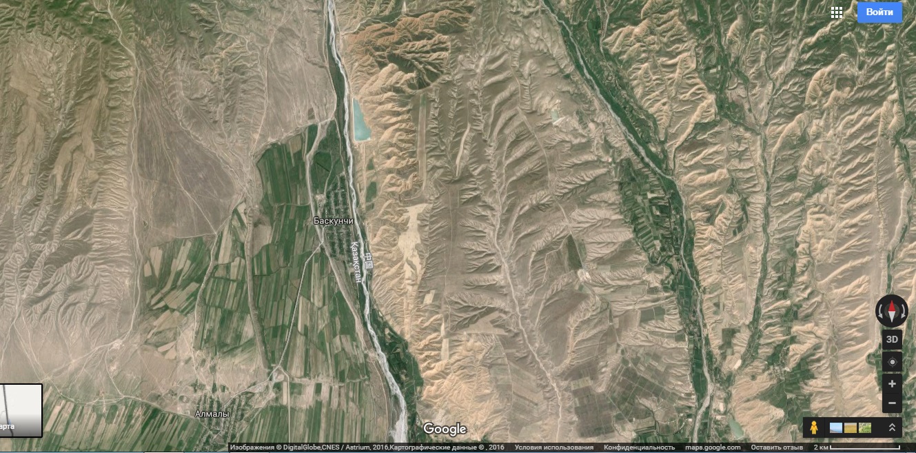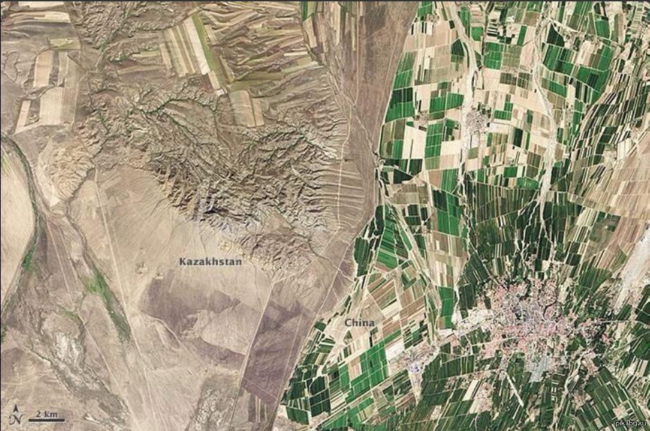 А это тоже казахско-китайская граница, возле села Баскунчи. Китай справа если что, там где нихрена не обработано, а слева - Алматинская область.