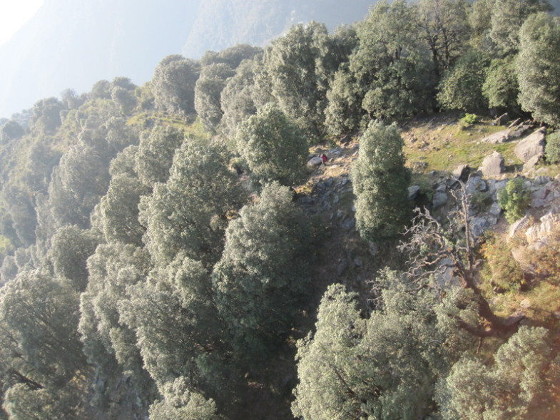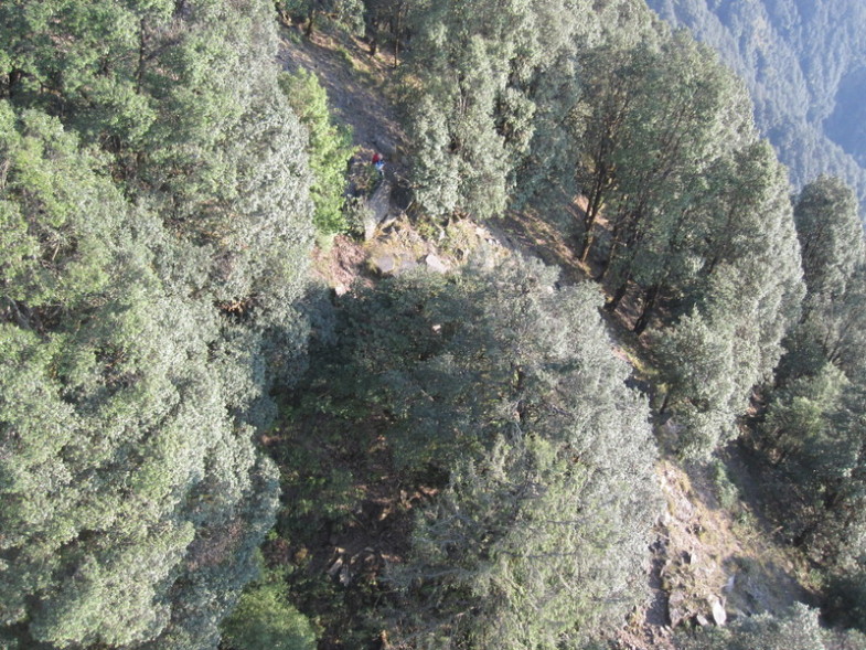 Легко летается в Бире: захотел - скрутился, захотел - набрался. Выбираюсь обратно наверх; Вова уже собрался и идёт по гребню отрога вниз. Летаю над ним, сопровождаю. Становится скучно. В голову приходит мысль, что ему понравится иметь фотки, в которых видно, как он бодро шагает по джунглям, вид сверху. Над гребнем постоянно поддерживает, так что можно летать туда-сюда, особо не заботясь о запасе высоты. Беру клеванты в одну руку, снимаю. Получается как-то мелковато: