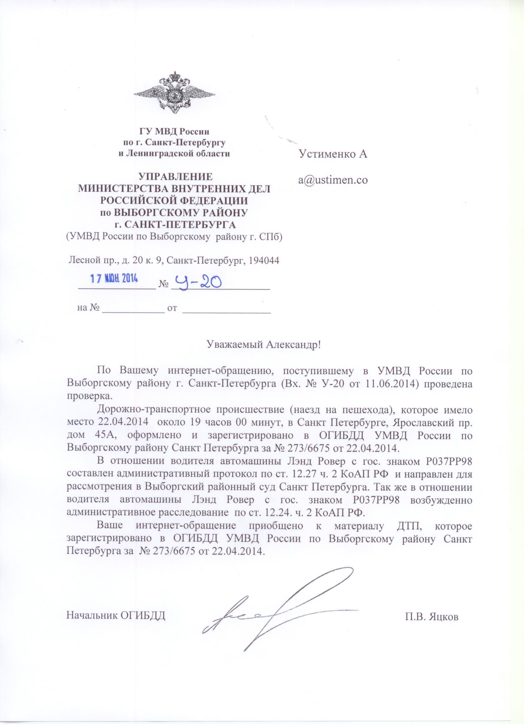 Устименко ответ на обращение зарегистрированное в канцелярии УМВД России по Выборгскому району СПБ № У-20 от 11.06.2014