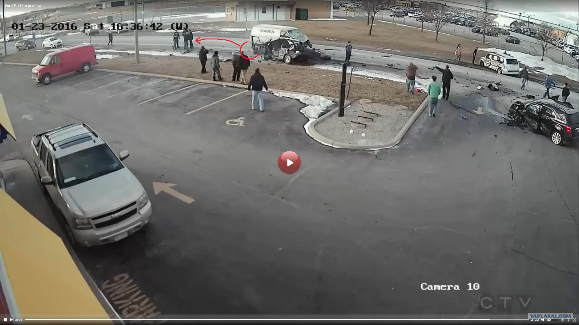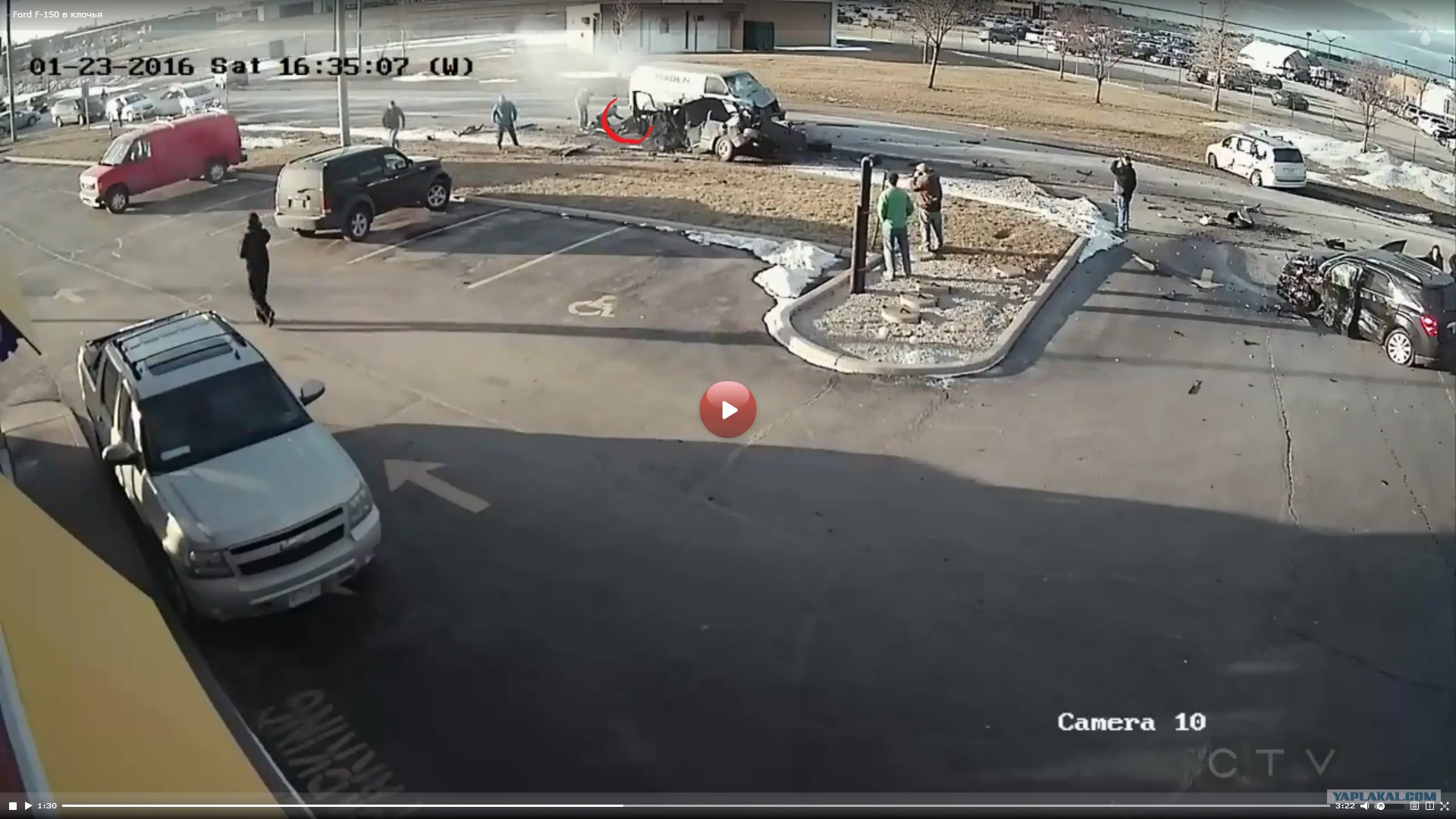 На кадрах видно, как Ford F-150 черного цвета вылетел на полосу встречного движения, где задел паркетник и опрокинулся на бок. После этого то, что осталось от пикапа, врезалось в фургон. Спустя несколько мгновений в объектив камеры наблюдения, зафиксировавшей происходившее, попал минивэн с серьезными повреждениями левого бока. По предварительной версии, появление Ford на "встречке" могло быть спровоцировано контактом с этим транспортным средством, однако полиция пока не обнародовала официальные итоги расследования.