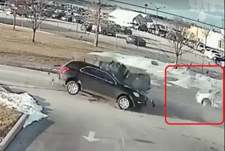 Первый удар между двух машин, тут он гасит инерцию, вырывает каптиви и себе колесо и крышей с кузовом въезжает в третью!