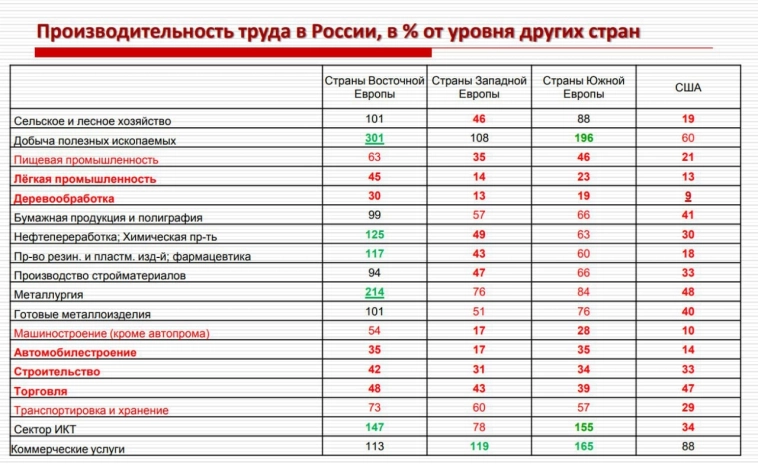 Производительность труда в России оказалась на дне в сравнении с другими странами, следует из обзора Центра макроэкономического анализа и краткосрочного прогнозирования. По некоторым отраслям отставание от стран Западной Европы шестикратное, от США – десятикратное.