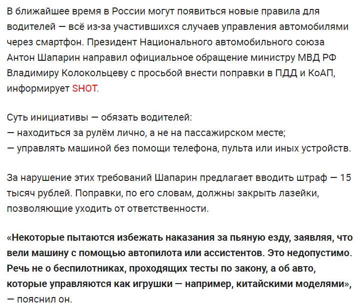 «Сейчас от ответственности, к примеру, за пьяную езду с помощью использования ассистентов помощи водителю пытаются уйти отдельные граждане. Понятно, что такое неприемлемо. Наше предложение не касается автоматизированного транспорта, который сейчас тестируется на дорогах в рамках экспериментального правового режима. А вот с «беспилотными» китайскими авто нужно навести порядок», — подчеркнул Шапарин.