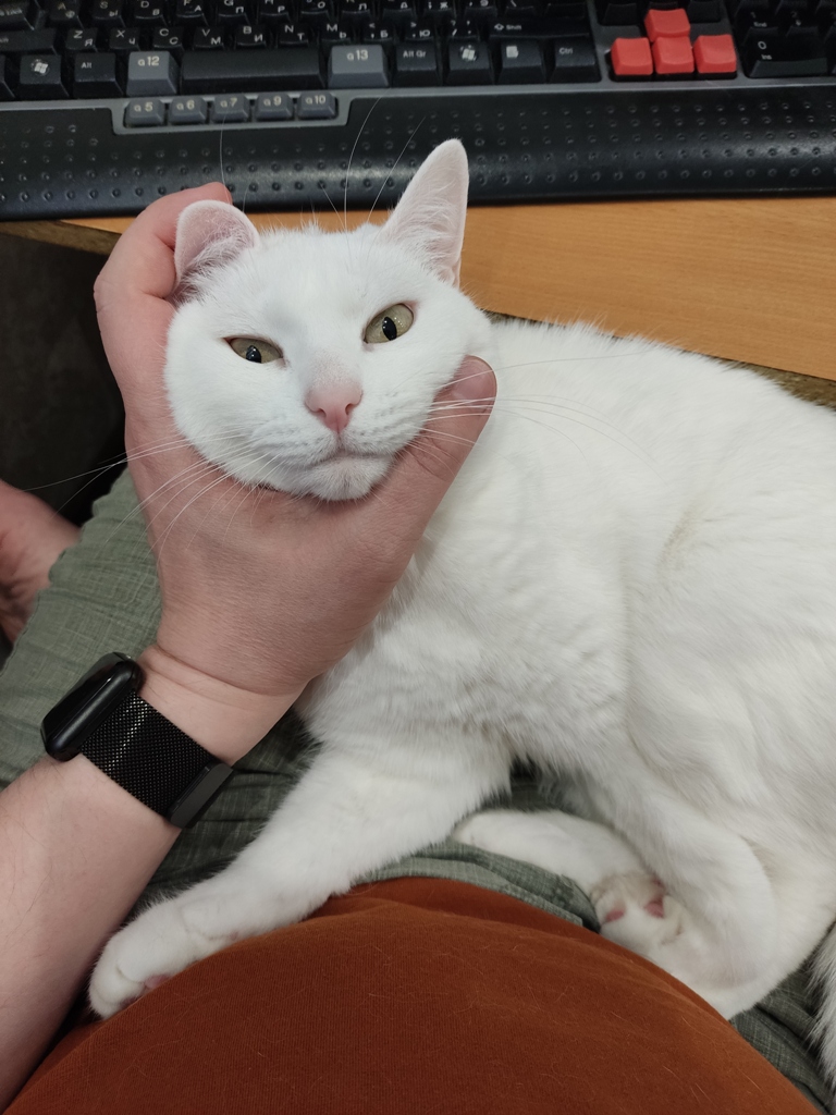 Пятница, лето 2014го, ехали к теще в областной город. Въехали уже, едем через промзону, слева сплошной заводской забор, справа овраг, и тут замечаю, как метрах в 50 впереди нечто белое перебегает дорогу слева направо. Жена подумала, что крыса. Нифига, котенок оказался. Тормознули и пошли в кусты искать. Нашли полностью белого котенка, месяц максимум, весь в блохах, живого места нет. Из последних сил жену укусил и отрубился. Привезли домой, отмыли, на лечение ухлопали бюджет африканской страны, но выходили. Щас это наглое белое чудовище лежит и греет пузо на батарее