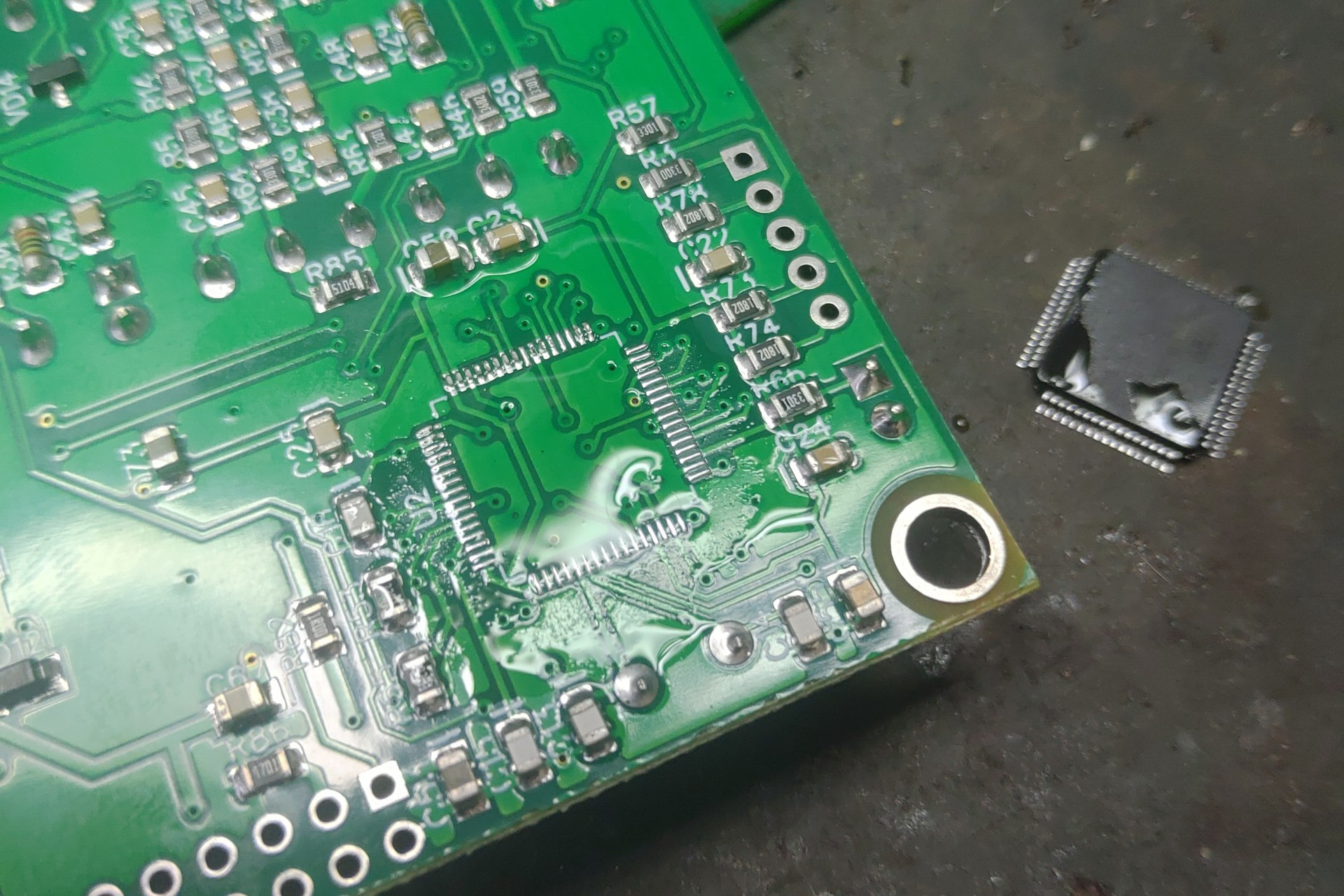 Интересно почему когда он микросхему снимал и всю плату этой жижой измазал, то только эта микросхема снялась, а все вокруг, точно также измазанные, остались на месте?