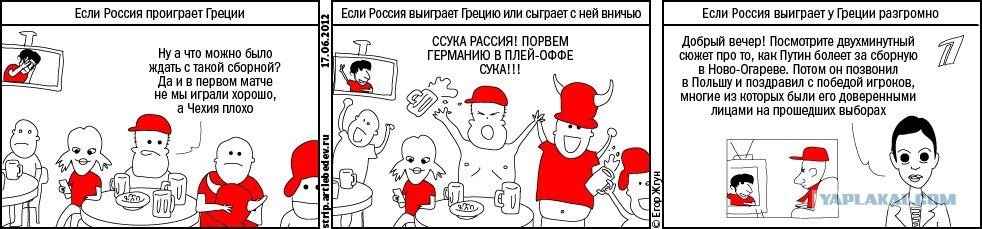А вы думали России дадут выиграть сначала в Польше у поляков, чтобы спровоцировать уличные битвы с участием толпы маргиналов с обеих сторон, коих и среди болельщиков и среди нациков местных полно? Или дать, например выиграть у Греции, где и так жесткий кризис и ожидание дефолта? Мое имхо, что глупо было-бы сильным мира сего упускать из рук такой мощный инструмент управления массами как футбол. Он приносит громадные прибыли и его все равно будут смотреть, денег на маркетинг хватает и пипл схавает все в любом виде. Современный футбол = рестлинг по европейски. А футболистам похер, они и так зарплату свою получат, можно и промазать пару раз, если хорошие люди просят. Это мое имхо, минусите.